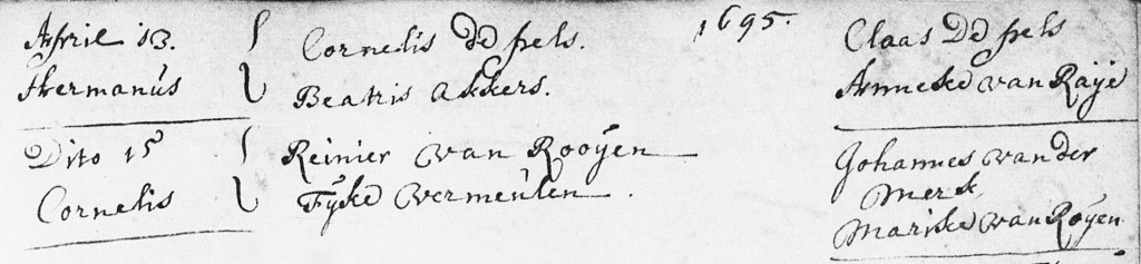 [1] Nederlands Hervormde Kerk (Zuid-Holland), Gorinchem, dopen 1619–1714. Doop Cornelis van Rooijen, 1695 via FamilySearch.org film 005849884, image 657.
