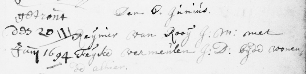 Reijnier van Rooij (as per marriage record) and Feijke Vermeulen were married on 20 June 1694 in Gorinchem.[2]